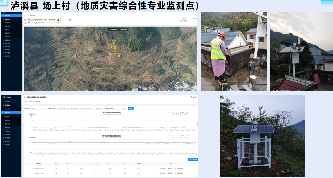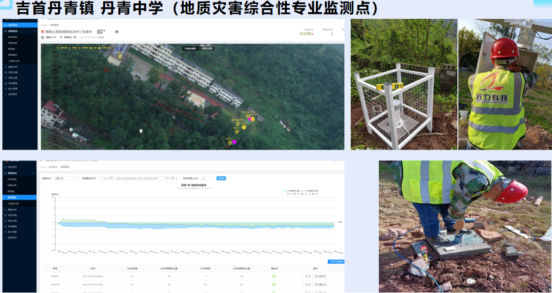 为实施好湘西州地质灾害综合性监测预警系统(专业监测)项目,前期,我司组织专业技术人员与湖南省湘西工程勘察院(405队),对永顺县、龙山县、保靖县、泸溪县、丹青镇滑坡、不稳定斜坡等地灾隐患点进行了全面排查,确定了监测预警系统的安装点位。监测预警系统以物联网、大数据、云计算、北斗卫星等技术为基础,以致力科技灾害地质与工程安全智能监测云平台为核心,结合专业地质灾害监测设备,实现了自动化远程实时高精度监测、智能预警预报、应急防治处治,全面提升了地质灾害监测专业化水平,为防灾减灾科学决策提供了平台、技术支撑,更好地保障了人民群众生命财产安全。