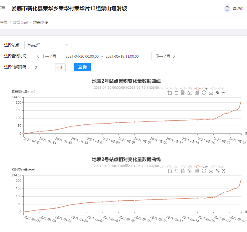 2021年05月19日凌晨,湖南省娄底市普降暴雨,其中荣华乡降雨量达到85.6mm。由湖南致力工程有限科技与湖南省地质院418队实施的娄底市荣华乡荣华村荣华片13组栗山垣滑坡地质灾害点,受特大暴雨影响出现滑坡现象,依托致力科技“致力云”监测预警平台在滑坡前约4小时发出红色预警,预警信息自动推送至各级主管部门并立即采取防灾避险措施,及时管制道路交通,成功避免了人员伤亡、财产损失。这次成功预警,是致力科技继湖南湘潭地灾项目、广西乐百高速伶站服务区高边坡滑坡等成功预警案例以来,再次及时预报滑坡等自然灾害。