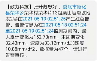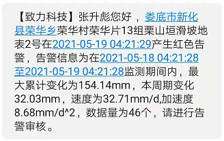 4月28日14:36,地表位移监测点出现位移变化,系统触发黄色预警警报;5月16日16:43,系统触发蓝色预警警报。5月17日23:32,地表位移监测点开始进入加速变形阶段,触发橙色预警警报,边坡处于不稳定状态,我方高度重视并重点关注。5月19日01:21,受特大暴雨影响,软件平台显示该地质灾害点地表位移GNSS2号的监测数据发生了较大变化,其累计位移、位移速率和切线角快速增大,触发了红色预警,并以短信形式自动推送至各级责任人员。致力科技监测值班人员在收到预警信息后,立即电话上报至项目负责人,经与主管部门沟通,前往该地质灾害隐患点进行现场核实,确认了滑坡变形特征,并立即启动防灾应急预案,组织受威胁群众4户29人避险撤离。