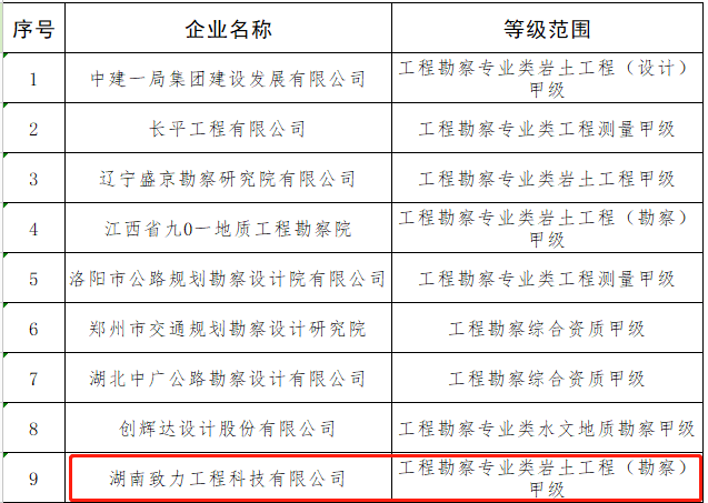 1月29日,中华人民共和国住建部发布《关于核准2022年度第一批建设工程企业资质名单的公告》,湖南致力工程科技有限公司喜获工程(岩土)勘察甲级资质,为湖南省本次唯一一家取得该项资质的单位,标志着公司资质建设取得重大战略突破,形成了新的差异化发展优势,进一步完善了特色鲜明的工程设计、勘察、咨询、检测、监测全过程咨询服务体系,夯实了公司专家(院士)工作站的技术基础,提升了公司核心竞争力和行业影响力。
