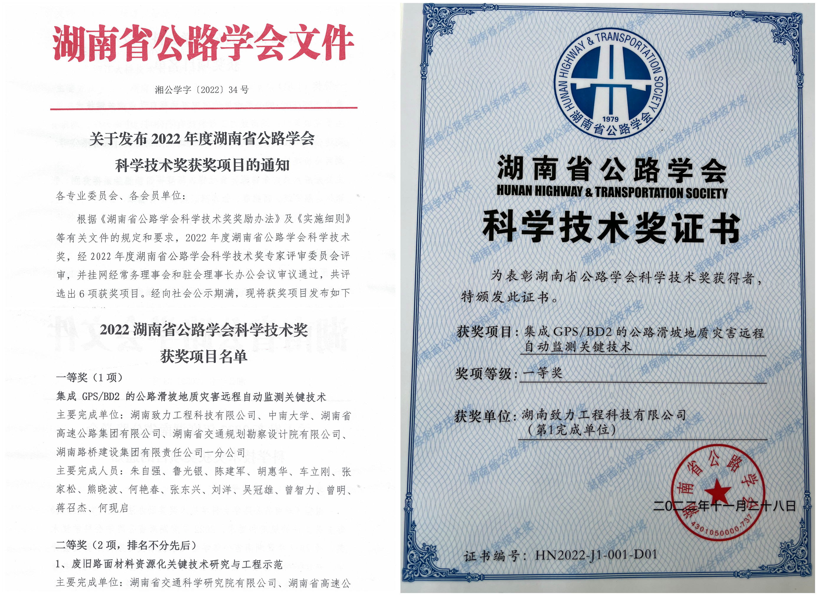 近日,湖南省公路学会“第八届八次理事会暨2022年学术年会”在长沙召开,会议对2022年度湖南省公路学会科学技术奖获奖项目、先进工作者和十佳优秀青年科技人才进行了表彰。湖南致力工程科技有限公司联合中南大学、湖南省高速公路集团有限公司、湖南省交通规划勘察设计院有限公司、湖南路桥建设集团有限责任公司一分公司完成的“集成GPS/BD2的公路滑坡地质灾害远程自动监测关键技术”研究成果荣获湖南省公路学会科学技术奖一等奖。