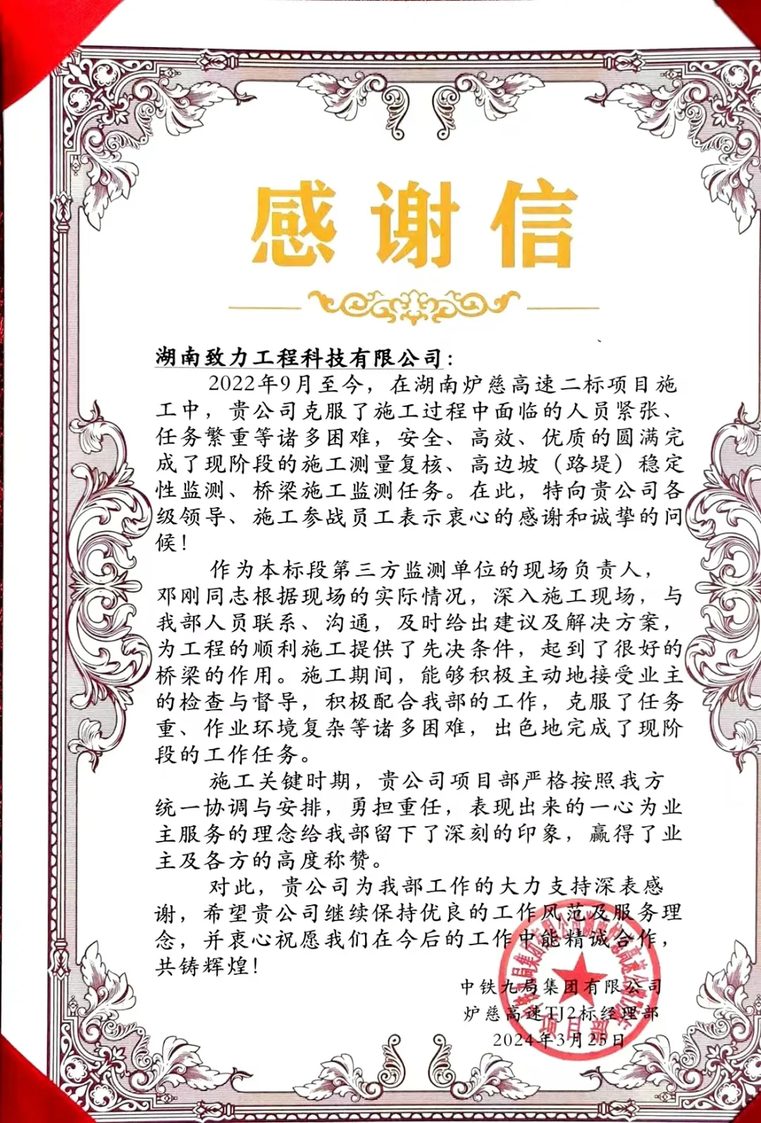满载“信”任,实力获赞!近日,湖南致力工程科技有限公司收到一封来自中铁九局集团有限公司炉慈高速TJ2标经理部的感谢信。