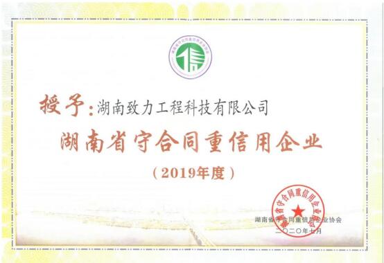 近期,湖南省、长沙市守合同重信用企业协会相继公布2019年度湖南省“守合同重信用”企业公示名单,湖南致力工程科技有限公司凭借良好信誉与优质服务,荣获“湖南省守合同重信用企业”
